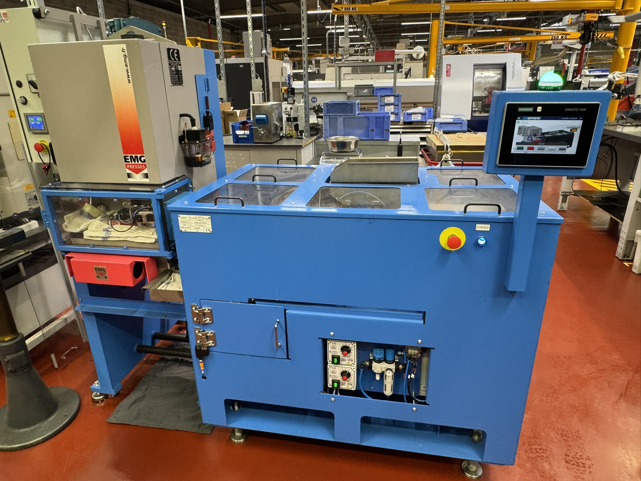 his machine provides automatic loading of parts into a press. Parts are unloaded in bulk into a vibratory bowl, where they are singulated and then picked up by a gantry to supply the press.