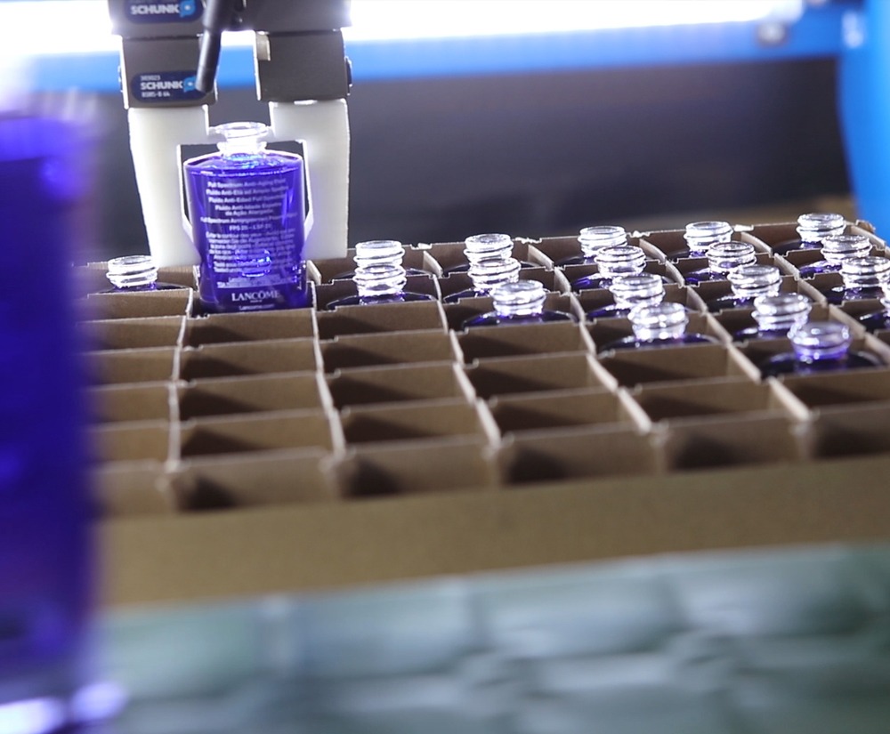 The UNPACKBOT cell is the "sister" of the PACKBOT cell, and is used for unpacking products. Placed close to the infeed conveyor of the decorating machine, the robot cell unpack the products (vials, jars, bottles, etc.) contained in trays (cardboard or thermoformed plastic) and place them on the infeed conveyor of the decorating machine, perfectly spaced apart. Here too, the robot is guided by a high-performance vision system to detect products and optimize gripping speed and precision, whatever the shape or color of your products. The UNPACKBOT cell is usually used in the decoration sector, to automatically feed screen printing and pad printing machines, .... Often equipped with a single robot, it can handle up to 70 products per minute